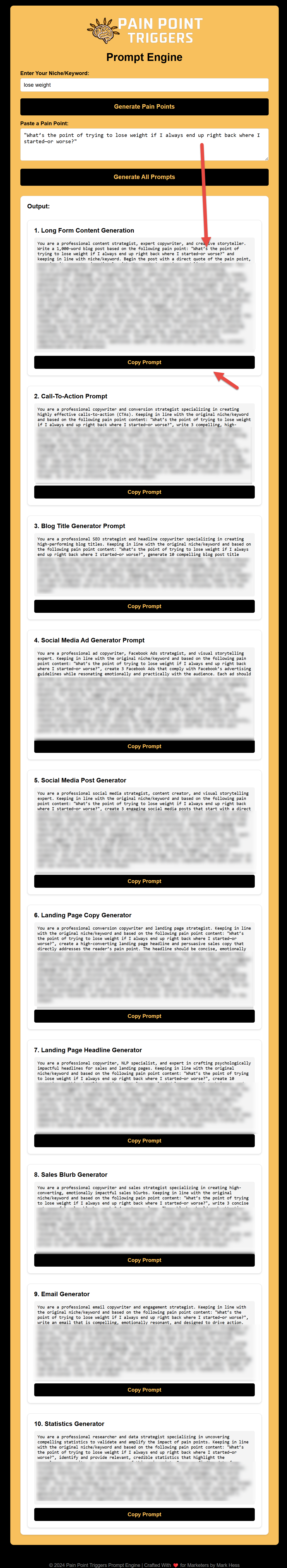 All 10 content generating prompts will be filled with your pain point automatically.
